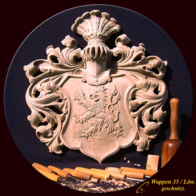 Unter anderem hat er sich auf das Gestalten, Schnitzen und fassen von Wappen aller Art spezialisiert. Seine Wappen sind mit Liebe zum Detail kunstvoll von Meisterhand geschnitzt. Er fertigt jedes Wappen in jeder Art und gewünschten Größe und bereichert somit seine adeligen Kunden die bürgerlichen Familien von Heute über die Zeit hinaus mit einem sichtbaren Zeichen. Ein Zeichen für Familie und Zusammenhalt vererbbar von Generation zu Generation, denn ein Wappen ist wie ein wertvolles Dokument.