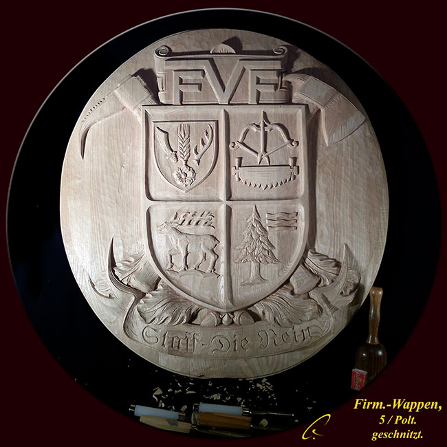Firmenwappen / Polt. 6 - geschnitzt, naturbelassen.