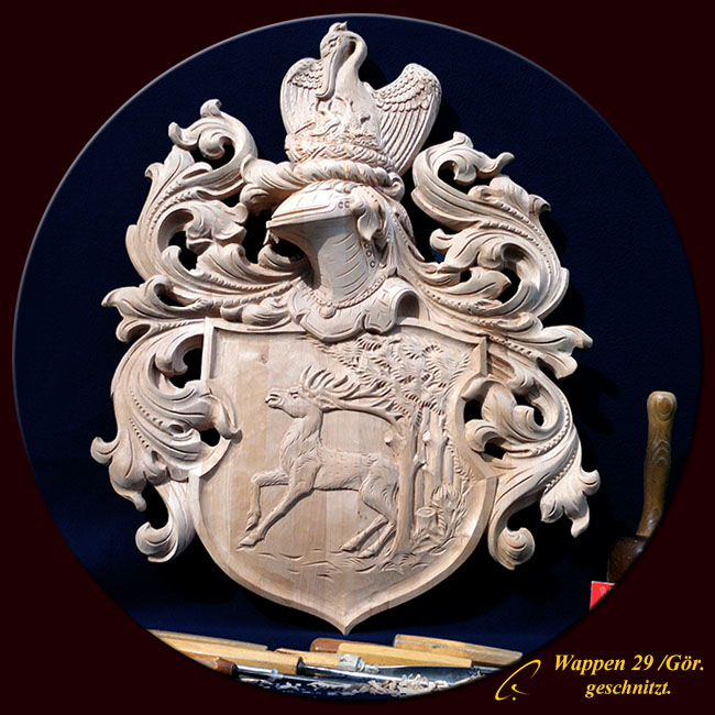Unter anderem hat er sich auf das Gestalten, Schnitzen und fassen von Wappen aller Art spezialisiert. Seine Wappen sind mit Liebe zum Detail kunstvoll von Meisterhand geschnitzt. Er fertigt jedes Wappen in jeder Art und gewünschten Größe und bereichert somit seine adeligen Kunden die bürgerlichen Familien von Heute über die Zeit hinaus mit einem sichtbaren Zeichen. Ein Zeichen für Familie und Zusammenhalt vererbbar von Generation zu Generation, denn ein Wappen ist wie ein wertvolles Dokument.