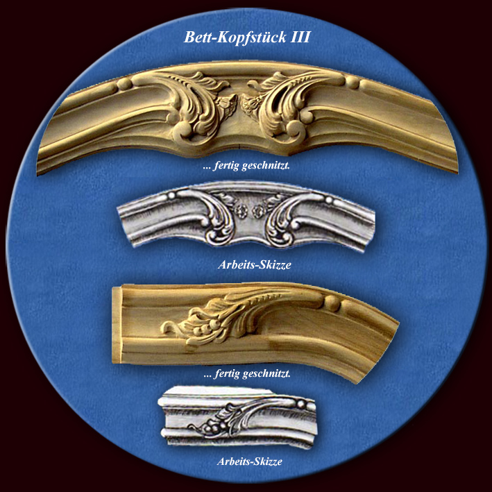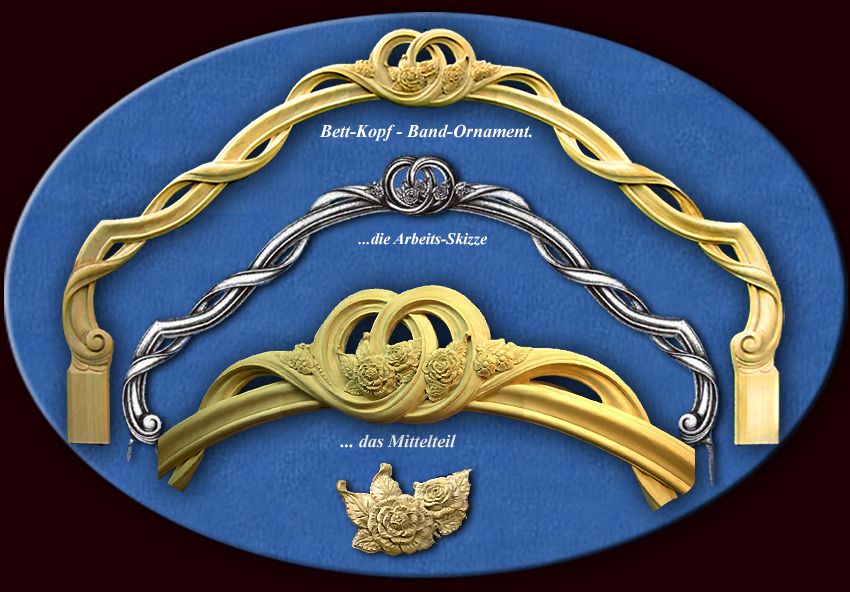 Jedes von uns gefertigte Ornament ist von Grund auf nur mit der Hand geschnitzt, und somit ein echtes Unikat. Das dargestellte Ornament ist ein Bettkopfstück, es ist in Tulip-Holz geschnitzt, später farbig gefasst und blattvergoldet.